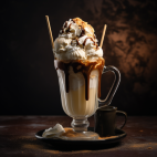 Iced coffee topped with a scoop of indulgent ice cream.