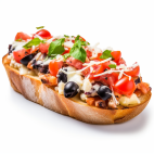 Classic Italian appetizer of French bread topped with tomato, cheese, and black olives.