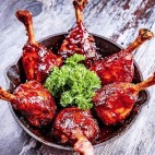 Succulent chicken drumsticks coated in a flavorful sauce.