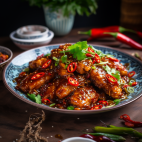 Fiery chicken dish with a red hot dragon sauce.
