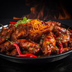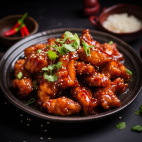 Spicy chicken tossed in a red chili sauce and served on a sizzling plate.