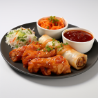 A trio of Chicken Chilli, Chicken Spring Roll, and Chicken Wings served with Kimchi.